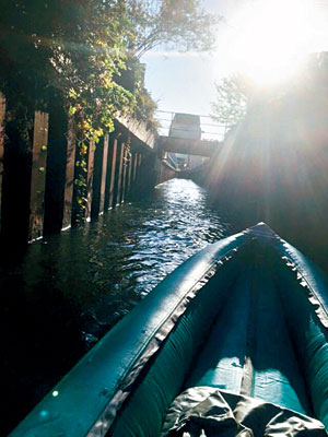 和歌山市中之島の自宅前を流れる有本川。カヤックで下ってみました。川幅が狭く水量が多いので流れに勢いがあり、風が気持ちよく、川面に差す光が柔らかくてあたたかい。