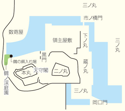 拡張工事は領主の居住空間(現在の二ノ丸)である屋敷へ及びます。屋敷の西(現在の大奥・西ノ丸庭園・山吹ノ渓)一帯の大きな水堀は屋敷を囲みますが、その一角には鶴が舞い降りる優雅な庭園まで造られました。
