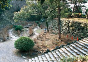 庭園は「鶴ノ渓」と呼ばれ、『紀伊国名所図会』には、庭園脇石垣の下に置く鶴の餌入れが描かれています。今も天守閣に、その現物(石)が展示されています。描かれた画と形が一致しているので、より信ぴょう性が感じられます。こうして和歌山城は、堅固な中に優雅な空間が生まれ、戦う城から住む城へ転じていくのです。