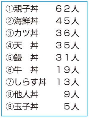 手軽に食べられる丼。トップは「とろとろ卵と鶏肉がバツグンのコンビネーション」と、幅広い年代から支持された親子丼でした。2位は海の幸に恵まれる和歌山らしく海鮮丼。最近人気のローストビーフ丼は、ご飯が見えないほどの肉と卵に食欲がわき、また、丼サイズの卵かけご飯を食べるなど豪快な回答もありました。 (回答数275)
