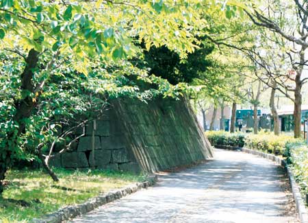 高石垣の一部に消滅した個所があります。和歌山市役所前の西堀に沿う歩道を南に折れて、堀が切れた辺りまで歩きます。そこに「この付近の石垣」と書かれた小さな説明板が木立の中にあります。この付近から不明(あかずの)門に続く石垣は、高石垣と呼ばれる事を記したあとに「江戸時代は前の国道24号のほぼ中央付近まで石垣が張り出していました」と旧状を伝え、「明治41年(1908)路面電車を通すため石垣が取り除かれた」と消えた石垣の理由が書かれています。