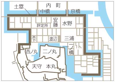 さらに三ノ丸の守りは、京橋門から東西に、高さ約7㍍、幅約33㍍の堤防のような大土塁(土盛り)が外堀に沿って、三ノ丸全体を囲むという厳重なものでした。このような守りを総構えと言います。