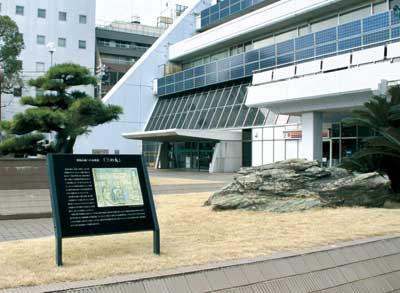 写真=市役所前の三ノ丸解説板/図=当時の三ノ丸の配置