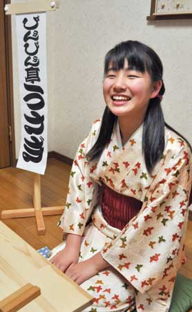 「ぴょんぴょん亭うさぎです!」。両手を頭にうさぎの耳を真似て登場し、客を和ませる。落語に入ると、そばをすすったり、酔っ払ったり、大人顔負けの仕草で作品の世界へ引き込む。これまで高座に上がったのは140回以上。「一人で何役も演じられるのが落語の面白いところ。表現を磨き、プロを目指したい」