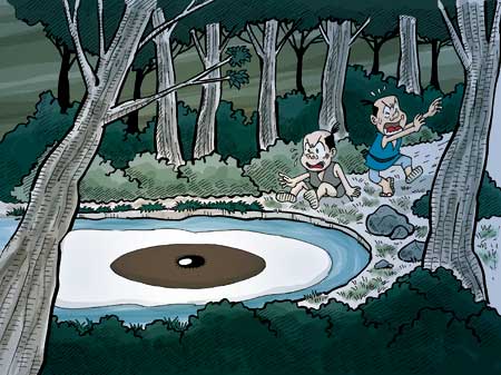 一つ目小僧や一つ目入道など、顔の中央に大きな目玉がどんとついている妖怪は多いが、和歌山に伝わる「一つ目」は少し違う。古池や沼、深い淵にすみ、人が来ると水の中でピカピカ光る。はじめは茶碗ぐらいの大きさで光っているが、見る見るうちに大きくなり、池いっぱいに広がって人を驚かす。上富田の「一つ目狸」も目を大きくさせて人を驚かせるが、そんな悪戯好きで一つ目の妖怪の正体は狸とされることが多い。しかし、池や沼にすむ狸はいない。さて、正体は?