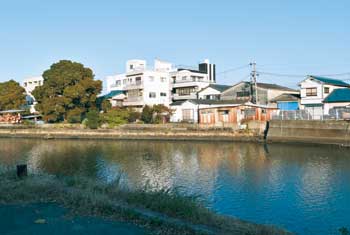 右奥に虎伏山がぼんやりと写っています。手前の陸地は鼠島で、この写真には写っていませんが、もう少し右手には市街地と鼠島を結ぶ当時の築地橋が架かっていて、今はその取り付け部の石垣がわずかに残されています。
