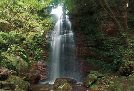 天狗岩と不動滝は、こうした村人の信仰を集めた神々の座なのである。滝は3本の滝筋をもった三条の滝で、あの那智の滝と同じく、三柱の滝だ。