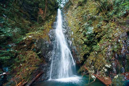 こうした故事が滝名の由来であると、地元の古老は伝える。不動明王像もあり、かつては祠があったという。七色の虹とは違う、仏教的に意味のある五色の滝なのだ。