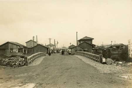 真田堀川に架かる木造の甫斉(ほさい)橋です。カメラは東向きです。現在とちがって自動車の通行も少ないのんびりとした時代です。