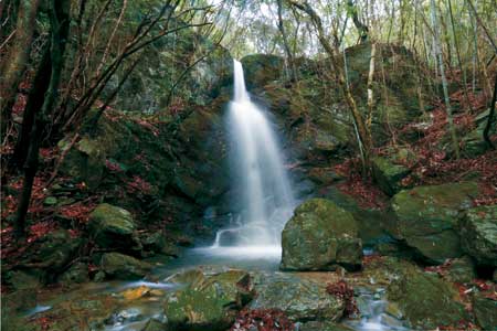 鏡石自然遊歩道コースを行くと、コッテの滝が見えてくる。滝の前に、なるほど牛に似た岩があり、見事な滝だ。