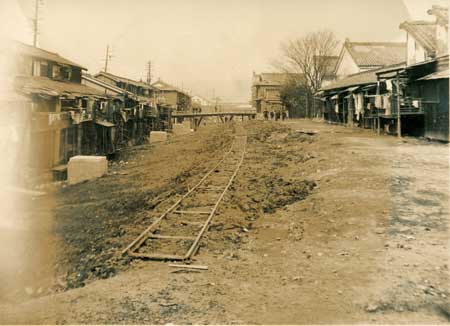 和歌山城の外堀を埋め立て中の写真です。外堀のうち、東側にあった屋形川か西側の西の丸川かと考えさせられる写真ですが、左側よりも右側の地面が高いため、城内側であることがわかります。