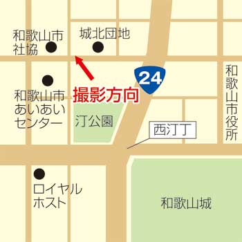また右手ののこぎり屋根の建物は垂直面の採光窓を北に向けています。直射日光ではなく、安定した光を得るためです。和歌山城の外堀を北向きに撮影して右側が城内で橋が写る場所は西の丸川の湊橋以外にはあり得ません。