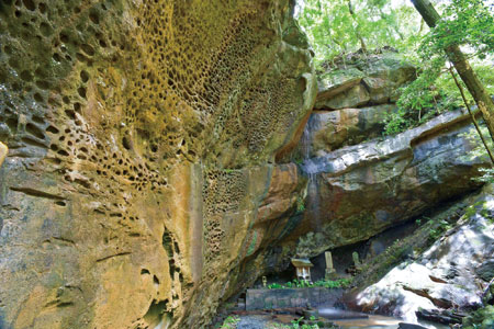 2000万年という気の遠くなる時間の差がある牟婁層群と田辺層群という岩層が接している極めて珍しい滝。水の沸き立つ「たぎる」が転じ、生まれた「滝」。水が蒸発する過程でこのような風穴ができたという。