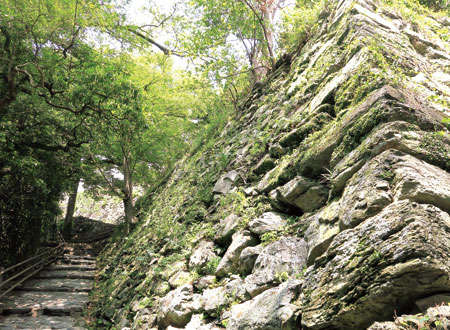 天守への急坂を登り切れば、藤棚のベンチや「お天守(てんす)茶屋」で一息つける天守前の広場に着きます。今でこそ憩いの場所ですが、往時は「天守下ノ段」と呼ばれた厳重な守りの広場でした。
