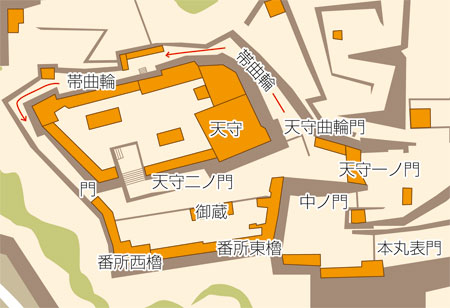 幕末に描かれた「和歌山御城内惣御絵図」(和歌山県立図書館蔵)による天守下ノ段は、ほぼ中央で東西に走る塀で二分され、塀の中ほどに大きな建物が描かれ、「御蔵」と表記されています。万一、敵が天守一ノ門から攻め登って来ても、天守の裏(北側)を周回する帯曲輪は、東側の天守曲輪門と西側の小門で、完全な防御壁が造られていましたから、天守下ノ段の二分された北側の狭い空間に入ると逃げ口がないのです。その頭上には、天守の石落(いしおとし)や銃眼が並んでいました。