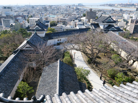 写真=大天守からの天守曲輪。右が乾櫓、左は天守二ノ門櫓