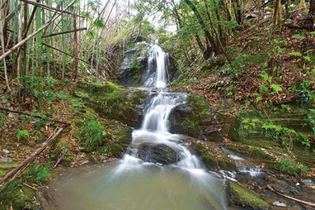 水神の森。こんなところに滝があるのかと疑いつつ、森に分け入り、沢を下る。竹林を抜けると、滝音とともに、目の前に4段の段瀑が広がった。農耕を守護する神霊を水分の神という。水を支配する神々こそ、我々の命を支えてきた神だとすれば、貴志川に落ちるこの滝は、まさに水神だ。