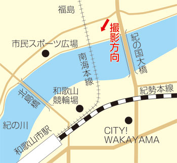 橋梁が完成する以前は、和歌山側の終着駅は紀の川北岸にある和歌山北口駅でした。鉄橋は明治三十六(一九〇三)年三月十八日の竣工です。トラス橋右横にかすかに虎伏山、和歌山城が見えます。この写真は、鉄橋の完成を記念して作成されたと考えられ、縦四〇×横六〇㌢の大型です。なお、この鉄橋は現在の南海本線上り線です。