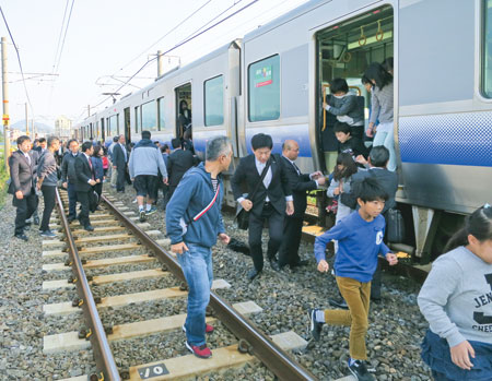 この教訓を、南海トラフ大地震への備えに生かそうとJR西日本和歌山支社などと協力し、地元住民を交えた避難訓練を実施(写真)。地震で緊急停止した場所から少し走れば高台に行ける場合があり、乗務員が扉を開けるまでは勝手に開けないなどの注意点を伝えたほか、電車の床から地面まで約160㌢の高さを、車内のハシゴを出して降りる訓練を行った。