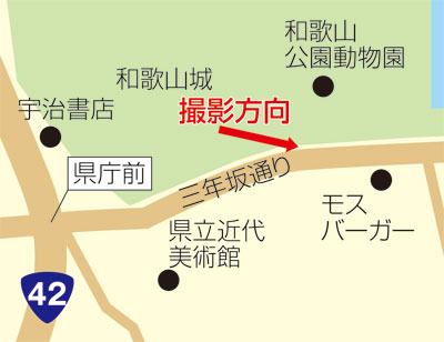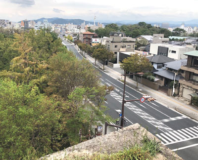カメラを高石垣から東方に向け、三年坂を見下ろしています。