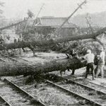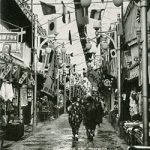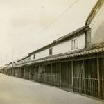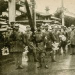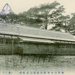 高石垣の角が写り込んでいます。衛戍地(えいじゅち)を和歌山市に定められた歩兵第六十一連隊が浜寺から移転した日の歓迎風景です。明治四十二年三月十七日でした。