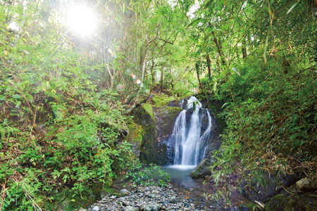 東大谷八幡神社の立派な社殿の裏に、滝はひっそりと流れている。滝壺は今も大小多くの石に覆われており、近くに、鎌倉期の宝篋(きょう)印塔、経巻や鏡が出土した県指定史跡の東大谷経塚遺跡がある。ここは鎌倉時代から信仰の場であったことは間違いなく、その対象はもちろん滝だ。
