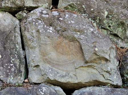 1977(昭和52)年度から82年にかけて行われた和歌山城三年坂沿いの石垣修復工事で砂ノ丸高石垣の修復記録を刻んだ碑に「砕石場所 泉南郡阪南町(現阪南市)山中渓」と表記されています。当地方には、多くのアンモナイトの化石を含む和泉砂岩の地層が分布しているそうです。それだけに、砂ノ丸広場から見る石垣のほぼ中程にある石が「アンモナイト化石」ではないかと注目されてきました。この石について、石に詳しい渡瀬敏文さん(元高校教諭)によれば、岩石を割った際、打点を中心に割れ口が放射状に広がり、それが風化して色づき、化石のように見える「偽化石(ぎかせき)」とのことです。