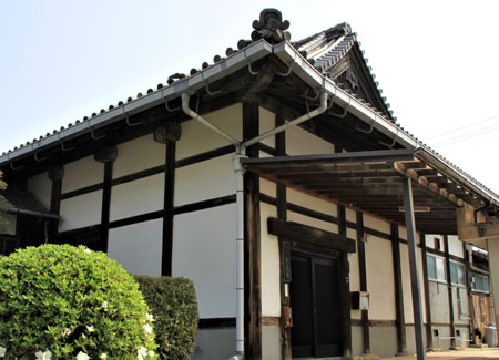 和歌山市大垣内の光恩寺庫裡は、玄関が建物の大きさに比べて小さく、外壁の太い柱間は白漆喰で塗り固められ、まさに城郭建築の様相です。1880(明治13)年、和歌山城本丸の御殿を本堂に、御殿の台所を庫裡として、当寺に移築されました。その翌年、移築工事中の暴風雨で御殿は崩壊したそうですが、台所は今も和歌山城の名残を伝え、和歌山市の文化財に指定されています。その玄関の内側には、かつての門扉がそのまま取り付けられた状態で保存され、室内には御殿にあったという虎の絵などが描かれた杉戸も残されています(非公開)。