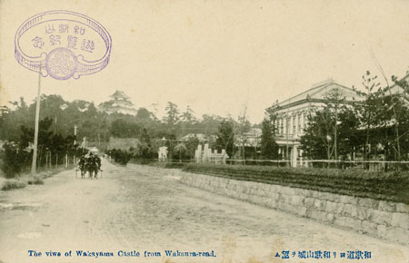 明治三十九(一九〇六)年ごろ、電車開通前の和歌道の光景です。右側の建物は、日本赤十字社和歌山支部です。