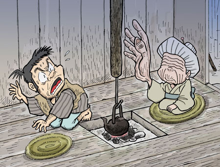 昔、惣七という男が、有田郡と日高郡の境にある鹿ヶ瀬峠へ猪を撃ちに行ったが、その日は一頭も出てこない。追い討ちをかけるように、みぞれまじりの雨が降り始めた。雨宿りの場所を探しながらの帰り道、古びた小屋が目に入ったので、飛び込んだ。そこには老婆がいて、「火に当たりなさい」と言いながら、薪をくべてくれる。安堵した惣七が何気に老婆の方を見ると、老婆が薪を一本くべるたびにその手が倍々に大きくなっていく。惣七はあわてて小屋を逃げ出したという。