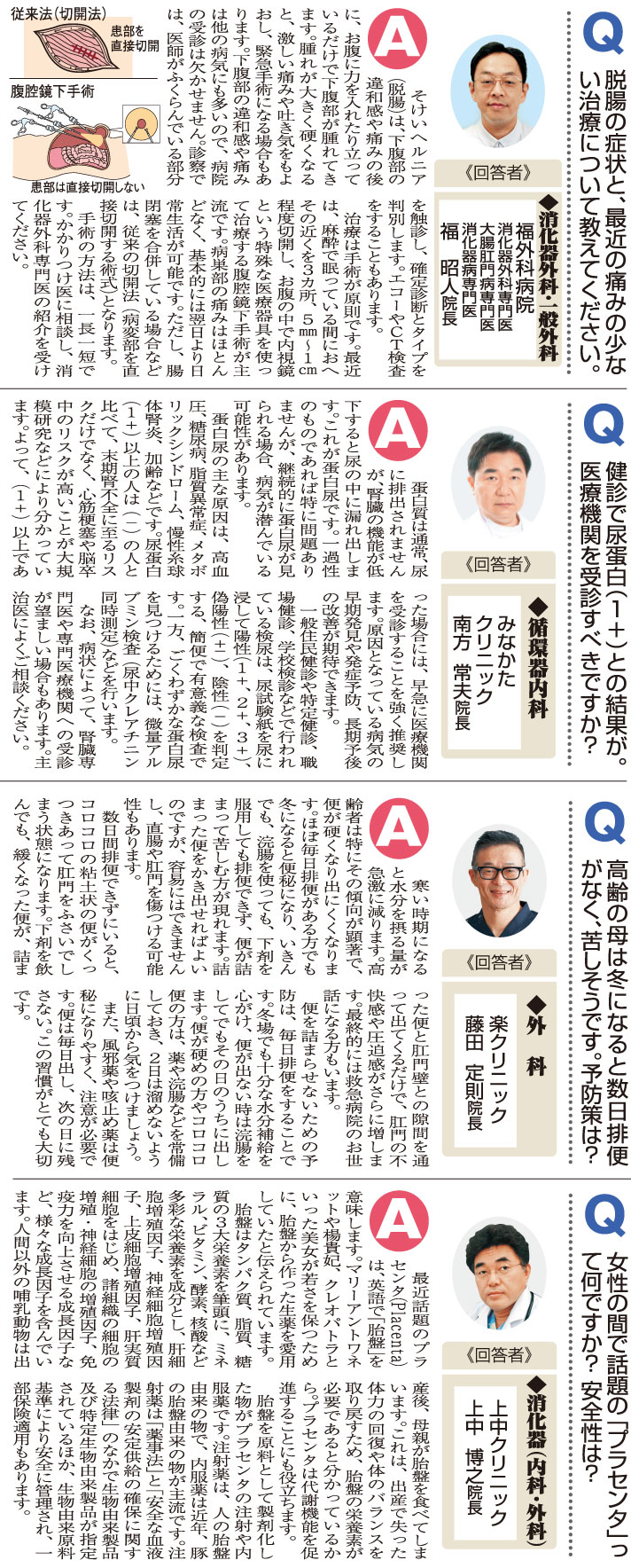 おしえて!マイドクターQ&A「脱腸」「尿蛋白」「排便がない」「プラセンタ」(2018.1.26)