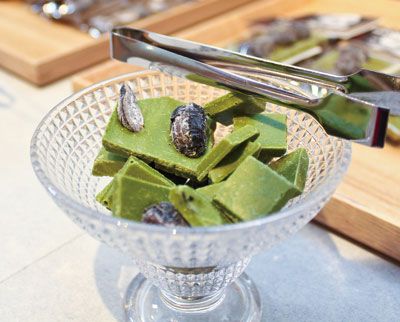 「板チョコの上にナッツやドライフルーツをトッピングしたマンディアンと呼ばれる菓子です。上の素材がチョコと一緒に口の中で溶けるよう、セミドライの果物を使ったり、ナッツの煎(い)る時間を細かく調整したりしています」