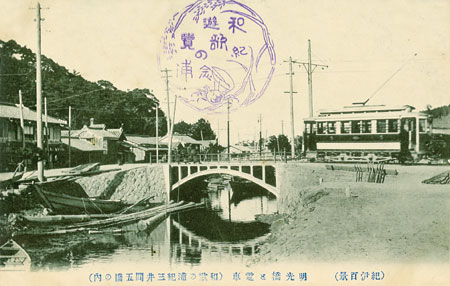 写真の電車は秋葉山方面行きです。キャプションに「和歌の浦紀三井間五橋の内」とあるのは、この明光橋、旭橋、中津橋(現在は中津川橋)と続き、紀三井寺停留所を降りると直線の門前通りにあった水路を跨ぐ小さな木橋が2ヵ所あったのをいいます。