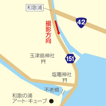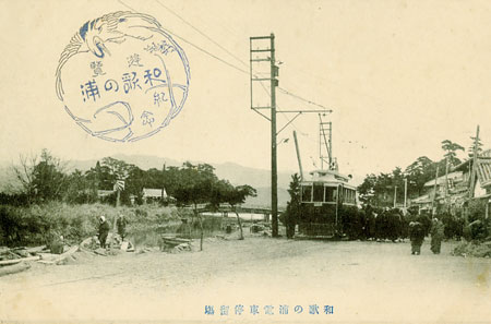 明治四十二年一月十九日付け紀伊毎日新聞によれば、電車開通当初の和歌浦停車場の所在は和歌浦町明光橋西詰です。写真のように玉津島神社の近くまで線路が敷設され、ここが終点でした。