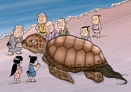 明治8年(1875年)、椒浦(はじかみうら、有田市初島町浜)に大きな亀が流れ着いた。大亀は瀕死の状態で、息も絶え絶え。土地の人々はかわいそうに思い、酒を飲ませて介抱したが、大亀はその甲斐なく死んでしまった。そこで人々はこの大亀の亡骸(なきがら)を松原の隅に葬り、祠を建てて祀った。すると、それ以来、大漁が続くと、「大亀さんの霊験だ」と信仰するようになった。この土地では無病息災を願って、名前に亀の一字をもらった子どもが多かったという。現在も地元の漁師たちは亀が浜に上がると、酒を飲ませて海に帰すのだそうだ。