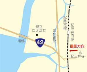 海水を引き込んだ入浜式塩田の浜みぞがくっきり見えます。道路はゆるくカーブして中津橋を渡って、くの字に折れ曲がった所に電車が止まっています。紀三井寺停留所です。