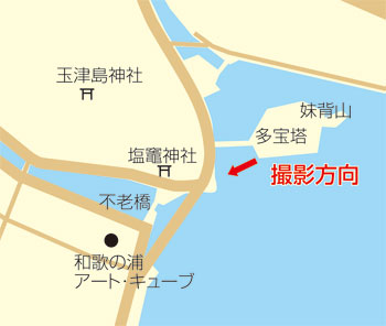 妹背山からみたあしべ屋と不老橋です。片男波海岸方面には建物がありません。
