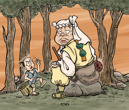 昔の人は規格はずれの巨大なものを崇(あが)めたり、妖怪視したりした。それは、大自然が育んだ未知を意味しており、大自然の前では人間はいかにちっぽけなものかを表している。特に大蛇や大亀、大蟹(おおがに)、大猫など、大きな動物の目撃例が多いが、こんな話もある。熊野山中の炭を焼く小屋に、しばしば7尺ほどの大山伏が来るという。7尺といえば2㍍以上。山中で出くわすと、さぞ驚いた事だろう。もし、その者が現れたら、魚や鳥の肉を火の中に入れれば、生臭さを嫌がって去ると言われている。同じ熊野では、白い装束姿の女が猪(いのしし)の群れを追いかけて出て来る事もあるそうだ。
