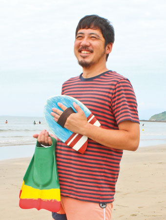 「茅ヶ崎でハンドプレーンを製作している方が昨年11月、うちのゲストハウスに宿泊したのが縁で存在を知りました。早速体験したところ、サーフィンとは違い、直接波を体に受ける感覚が新鮮で面白いと思いました。普通のサーフボードと違って、A4サイズで軽く、カバンに入れて持ち運べ、旅先でも手軽にできます。また、波を見極めたり、つかむ感覚を養え、サーフィンの練習にもなります」