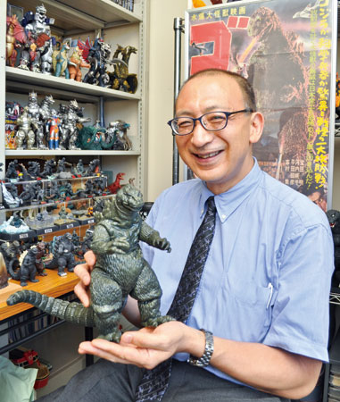 「フィギュアなど300点以上、ポスターや映像資料もあります。小学校低学年のころ、映画館で初めて『ゴジラ』第1作目を見ました。1度見ただけなのに、セリフや場面を鮮明に覚え、しばらくゴジラに追いかけられる夢ばかり見ました。怖いけど、すっかりファンになりましたね」