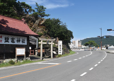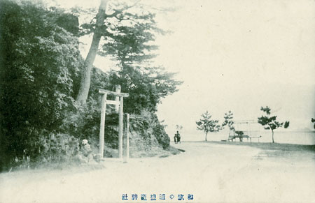 鳥居の背後の岩場に立つ松の大木は、和合の松として親しまれましたが、平成二十四(二〇一二)年六月二十三日朝、根元から折れて倒れました。道路から海面に突き出た作り物はあしべ屋旅館の休憩所です。