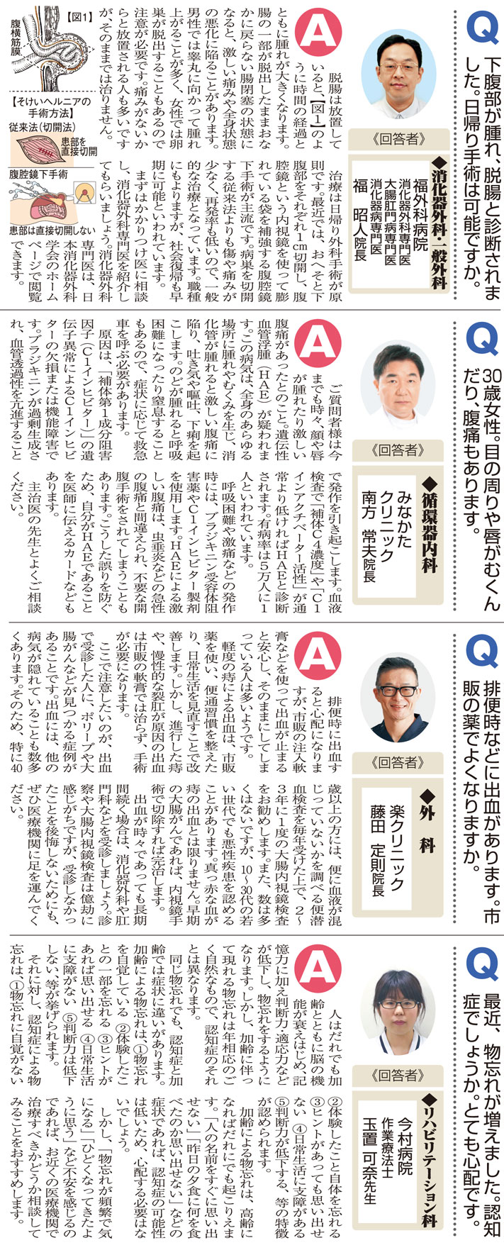 おしえて!マイドクターQ&A「脱腸」「遺伝性血管浮腫」「排便時の出血」「物忘れ」(2019.9.28)