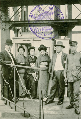 エレベーターにはエレベーターガールと呼ばれた係員がいたと言われます。髪を結った和装であったといいますから、この中に写る女性の中にいるかもしれません。人物と比べてもエレベーターのかごは窮屈そうに見えます。