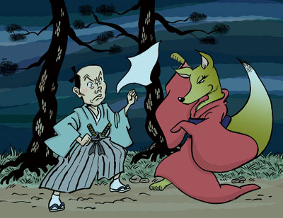 昔、 和歌山市の高松から和歌浦にかけて松並木が続き、そこに茶屋が3軒ほどあった。それぞれ美しい女を雇い、繁盛していた。そこに目をつけたのが、この松林に棲む性悪の女狐。人間の美女に化け、道行く人に悪さをする。城から退治に出た若侍らはまんまと狐に化かされる始末。そこで登場したのが、文武に優れた関戸加茂四郎という侍。騙されたふりをして狐に着いていき、ころあいを見計らって懐にしたためた石を投げつけて退治した。その後、女狐は悪さをしなくなったが、加茂四郎がここを通ると、松の上から小石が降った。