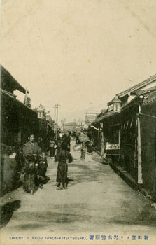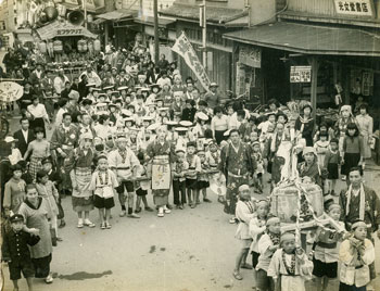 昭和30年代の北ブラクリ丁です。商工祭での出し物で、ハッピに「北ブラクリ丁」の文字が見えます。角の店舗は光文堂書店のようです。