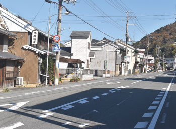 岩出市を走る大和街道です。写真の突き当たるところにかつての岩出警察署がありました。古風な民家が並び、遠くに龍門山がうっすらとみえています。