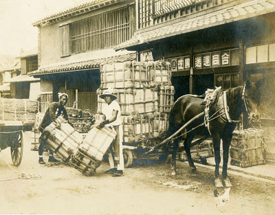 昭和初期の海南市黒江です。荷造りした漆器を馬の荷車に積み込むところです。町屋風の建物に「合同運送黒江」の文字が見えます。