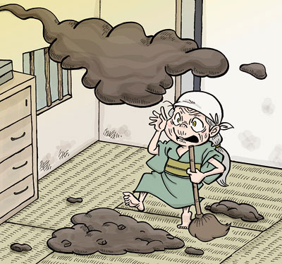 今から、およそ80年前の話。日高町のある家で、部屋の片隅から片隅に向かって、土が飛ぶ珍事が起きた。その様子を見た人によると、土はどこからともなく飛んできたという。部屋にばら撒かれた土の量はものすごく、家の者が掃いても掃いてもきりがないほどであった。昔から、夜道や森の中で、突然、砂や小石が降ってくる怪事は全国に聞かれ、狐や狸の仕業だとされる話が多いが、降ってくるものが土で、場所が部屋の中なんていう話は他に類を見ない。和歌山にはまだまだ、おもしろい妖怪がいそうだ。
