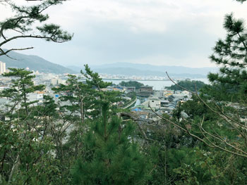 妙見山からの撮影です。ほぼ中央に小さく写っている島は妹背山です。島に見える建物はあしべ屋旅館の妹背別荘・玉突場です。