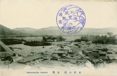 眼下に見える家並みは現和歌浦中三丁目、津屋川を挟んだ和歌浦東四丁目には旧湊御殿の一部を移築した建物以外、なにも見当たりません。左にみえる電車線路は今の国道四十二号です。紀三井寺方面から和歌山市街に向かう電車は、カーブになっているところの明光橋にさしかかろうとしています。
